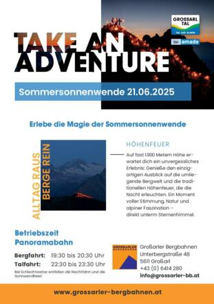 Bestaunen Sie das Abbrennen der Höhenfeuer zur Sommersonnenwende, denn da stehen im Großarltal die „Berge in Flammen“. Bei der Laireiteralm haben Sie einen besonders schönen Ausblick auf die umliegenden Berge. Dazu gibt es Live Musik von der Band „Starke Mander“ und gutes Essen. Die Feuer bei der Laireiteralm werden um ca. 22.00 Uhr entzündet. Zur Laireiteralm gelangen Sie ganz bequem mit der Panoramabahn, diese am Abend in Betrieb ist. Sonderfahrzeiten: Bergfahrt: 19:30 bis 20:30 Uhr; Talfahrt: 22:30 bis 23:30 Uhr. Findet nur bei schönem Wetter statt.