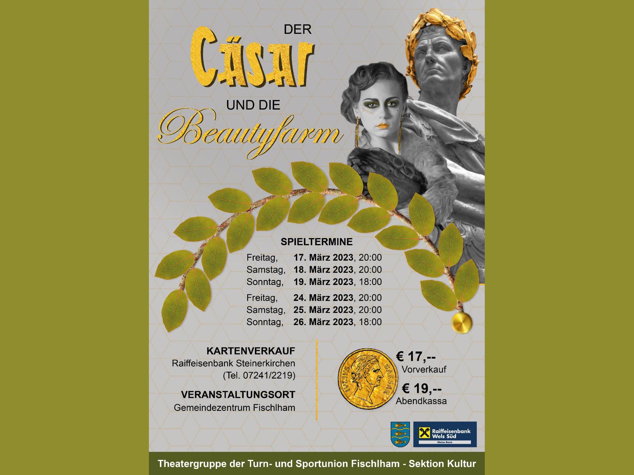 Die Union Fischlham - Sektion Kultur präsentiert das Theaterstück "Cäsar und die Beautyfarm" an zwei Wochenenden, bei dem garantiert die Lachmuskeln strapaziert werden. Karten gibt es bei der Raiffaisenbank Steinerkirchen.