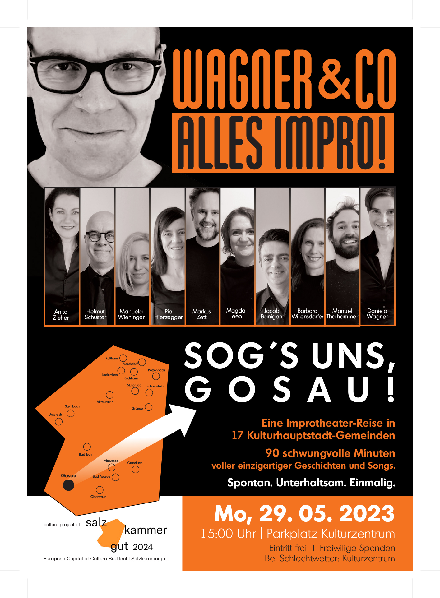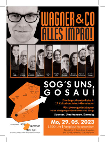 können alle Anwesenden mitentscheiden, worum es auf der Bühne gehen soll. Egal, was Gosau zu Pfingsten 2023 gerade bewegt – einfach rausrufen, und schon werden die Themen von WAGNER & CO aufgegriffen und spontan in kurzweilig improvisierte Geschichten und Songs verwandelt. Kein Textbuch, keine Regie - alles wird im Moment auf die Bühne gezaubert.
