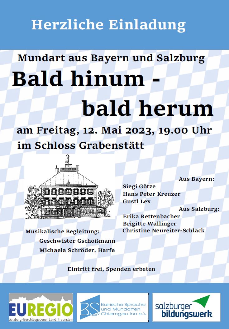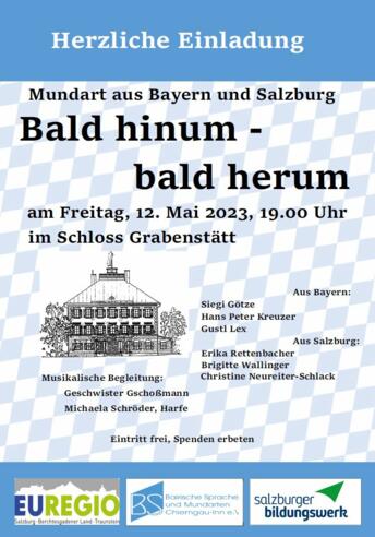 Der Verein Bairische Sprache und Mundart Chiemgau-Inn lädt zusammen mit der EUREGIO, dem Salzburger Bildungswerk und der Gemeinde Grabenstätt zu diesem lieterarischen Abend der besonderen Art ein. Aus Salzburg sind Erika Rettenbacher, Brigitte Schorn und Christine Neureiter-Schlack vertreten. Die bayerischen Autoren sind Siegi Götze, Hans-Peter Kreuzer und Gustl Lex. Begleitet werden die Lesungen von der Familienmusik Gschossmann und Michaela Schröder an der Harfe. Der Eintritt ist frei, alle Interessenten sind herzlich willkommen.