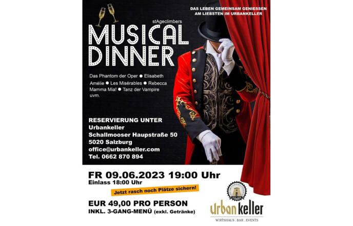 Kulinarische Genüsse treffen beim Musical Dinner im Urbankeller Salzburg auf die schönsten Melodien der Musicalgeschichte – erleben Sie ein Feuerwerk der Emotionen mit bekannten Songs aus Musicals wie Das Phantom der Oper, Tanz der Vampire, Les Misérables, Elisabeth, Mamma Mia und vielen weiteren Broadway- und West End-Highlights!