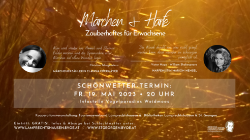Ein ganz eigenes stimmungsvolles Ambiente legt sich Abends über das Vogelparadies Weidmoos, das man unbedingt mal erlebt haben sollte. Die Märchenerzählerin CLAUDIA EDERMAYER und der Harfenistin MARION HENSEL begleiten sie literarisch und feengleich durch den Abend. Ein sehr eindrucksvolles berührendes Event!