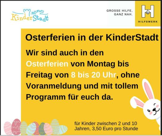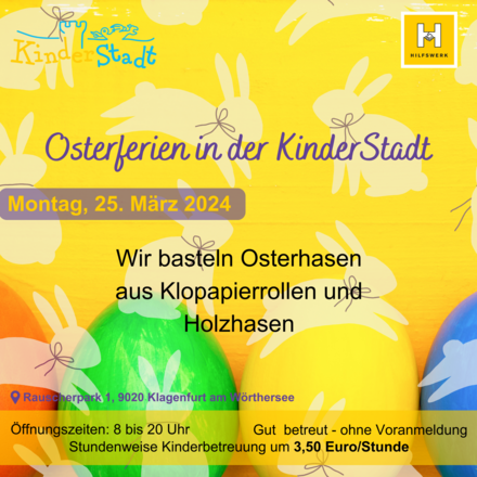 Die KinderStadt Klagenfurt im Rauscherpark 1 bietet auch in den Osterferien Kinderbetreuung zum Preis von 3,50 Euro pro Stunde an. Und das natürlich ohne Voranmeldung. In der Ferienwoche sind unsere Pädagoginnen von Montag bis Freitag von 08 bis 20 Uhr für die Kinder da.