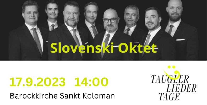 Im Rahmen der Taugler Liedertage verwöhnt Sie am Sonntag, 17. September 2023 um 14.00 Uhr das Slovenski Oktet in der Barockkirche St. Koloman.