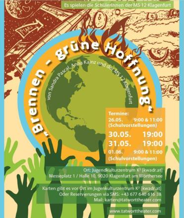 TatWortTheater präsentiert in Kooperation mit der NMS 12 St. Ruprecht in Klagenfurt die Stückentwicklung „Brennen – grüne Hoffnung“. Das Theaterprojekt will Mut machen eine Meinung zu dieser brisanten Aufgabe zu bilden und bei uns selbst zu beginnen, eine Veränderung hervorzurufen.