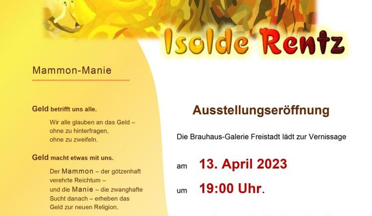 Der Mammon - der götzenhaft verehrte Reichtum - und die Manie - die zwangshafte Sucht danach - erheben das Geld zur neuen Religion. Gezeigt werden Werke in Acryl und Aquarell zum Motto uns zu weiteren zeitkritischen Themen, aber auch dekorative und florale Malerei sowie Motive von der Stadt, Land und Malreisen.