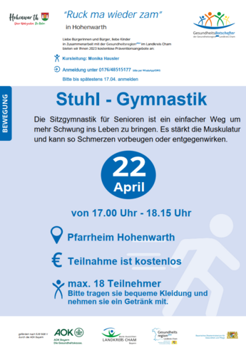 Die Sitzgymnastik für Senioren ist ein einfacher Weg um mehr Schwung ins Leben zu bringen. Es stärkt die Muskulatur und kann so Schmerzen vorbeugen oder entgegenwirken. von 17 Uhr bis 18.15 UhrPfarrheim HohenwarthTeilnehme ist kostenlos.maximal 18 TeilnehmerBitte bequeme Kleidung und nehmen Sie ein Getränk mit.Kursleitung: Monika HauslerAnmeldung bis spätestens 17.4. 2023 bei Ivonne Hemmert: 0176/48515177 per whatsapp oder SMS