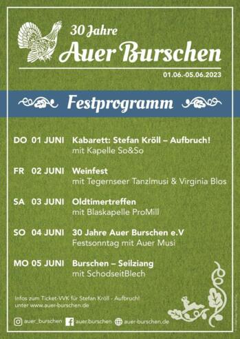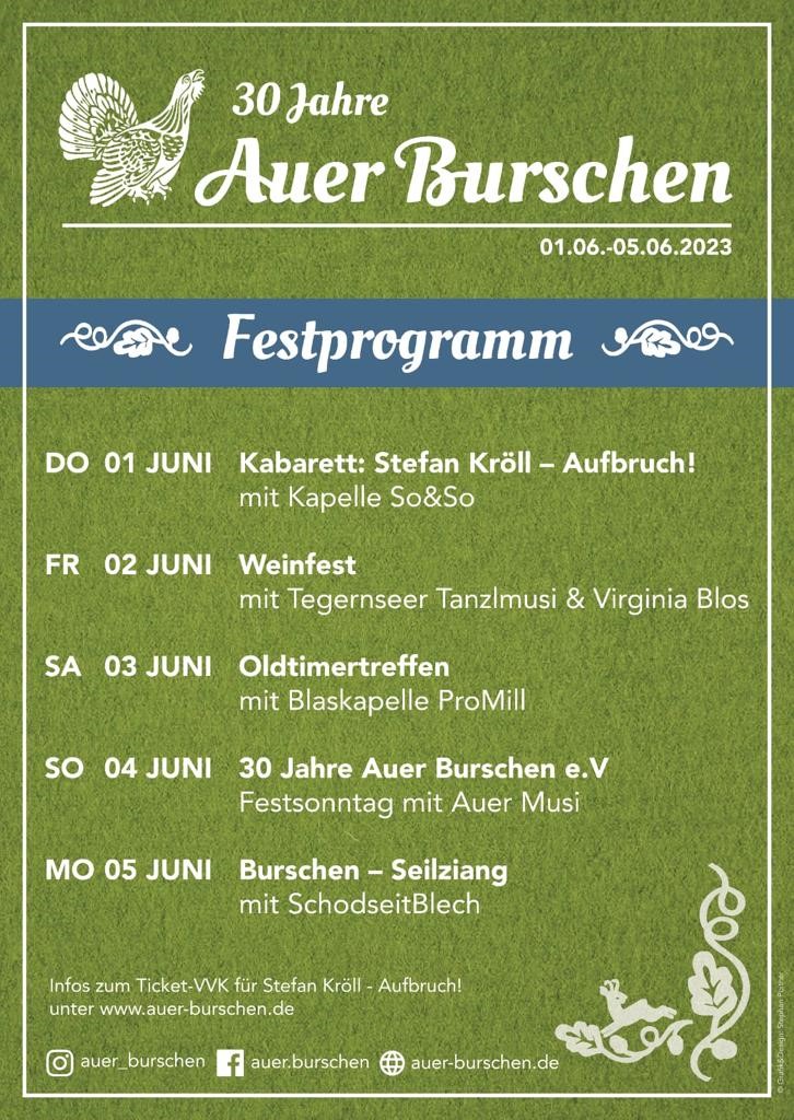 Der Festsonntag stellt den Höhepunkt unserer Festwoche dar. Über 1500 Burschen und Dirndl feiern mit uns 30 Jahre Auer Burschen.