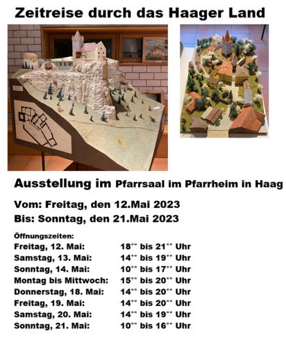 Die Ausstellung findet vom 12. Mai bis zum 21. Mai im Pfarrheim in Haag statt und ist für alle Interessierten geöffnet. Wir freuen uns besonders, auch Schulklassen und Gruppen willkommen zu heißen, um die Geschichte der Grafschaft Haag hautnah erleben zu können.