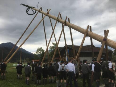 Traditionelles Maibaum Aufstellen beim Jägerwirt in Ort bei Kochel a. See.