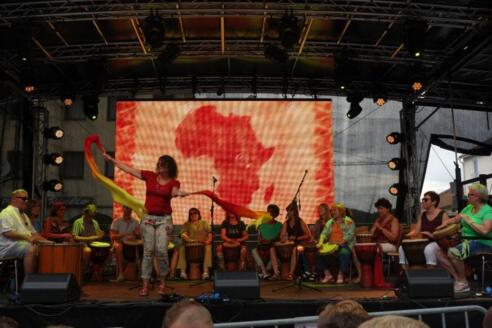 Einmal so richtig auf die Trommel schlagen. Geleitet von Sigi Lee, können Besucherinnen und Besucher Teil eines kollektivem Trommelerlebnis werden.