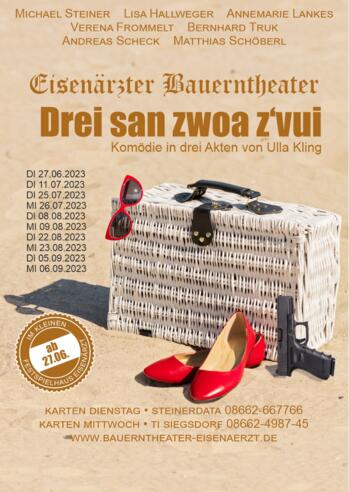 Das Bauerntheater Eisenärzt präsentiert sein neuestes Stück "Drei san zwoa z'vui". Kartenvorverkauf für Dienstag bei Steiner Data Eisenärzt, gegenüber vom Theater, Tel. 08662/667766, für Mittwoch Tourist-Info Siegsdorf, Bahnhofstr. 1, Tel. 08662/498745.