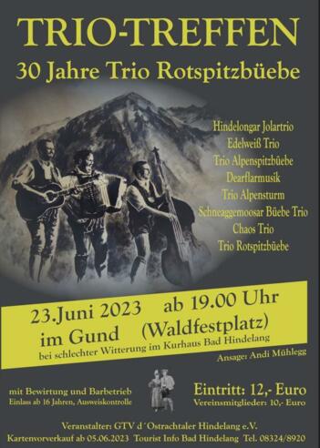 "Trio-Treffen" 30 Jahre Trio Rotspitzbüebe am Fr. 23.06.2023 ab 19.00 im Gund (Waldfestplatz) bei schlechter Witterung im Kurhausmit BewirtungMitwirkende:Hindelongar JolartrioEdelweiß-TrioTrio AlpenspitzbüebeDie Junge DörflarTrio AlpensturmSchneaggemoosar Büebe TrioChaos TrioTrio RotspitzbüebeAnsage: Andi Mühlegg