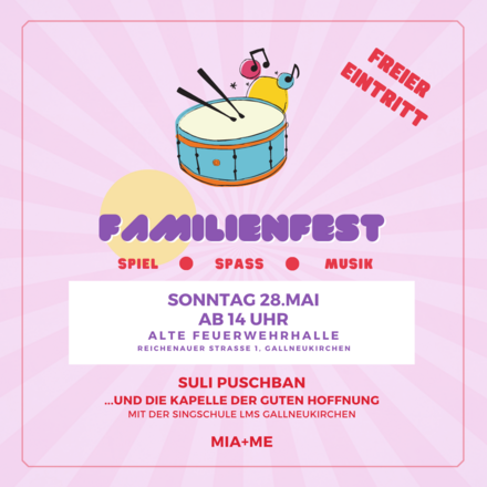Im Zuge des 30-jährigen Jubiläums laden wir zu einem lustigen Fest für die ganze Familie ein. Kostenloser Eintritt zu einem wunderschönen Nachmittag mit Spiel, Spass und Musik. Suzi Puschban und die Kapelle der guten Hoffnung wird begleitet von der Singschule der LMS Gallneukirchen und Max Grubmüller wird gemeinsam mit seiner Tochter auftreten. Für das leibliche Wohl ist gesorgt - freuen Sie sich auf Schmankerl und traumhafte Mehlspeisen. Wir freuen uns auf die gemeinsame Zeit.