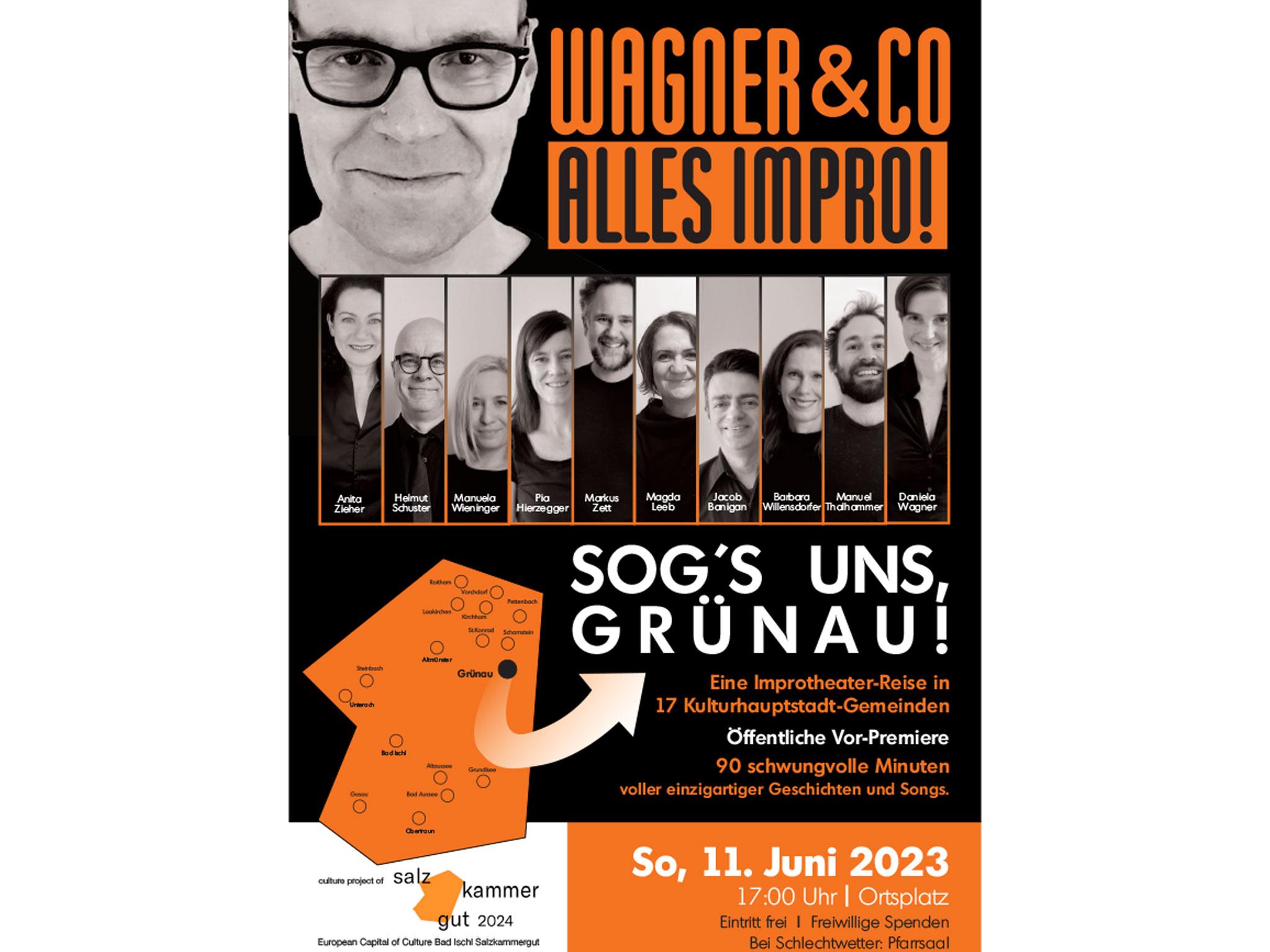 Nach dem Motto „SOG’S UNS, GRÜNAU!“ können alle Anwesenden mitentscheiden, worum es auf der Bühne gehen soll. Egal, was Grünau im Frühsommer 2023 gerade bewegt – einfach rausrufen, und schon werden die Themen von WAGNER & CO aufgegriffen und spontan in kurzweilig improvisierte Geschichten und Songs verwandelt. Kein Textbuch, keine Regie - alles wird im Moment auf die Bühne gezaubert.