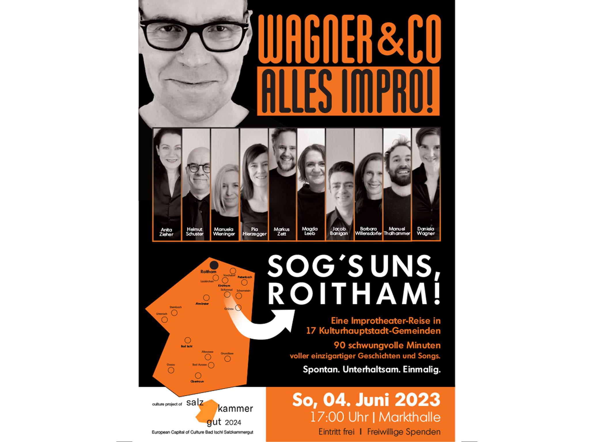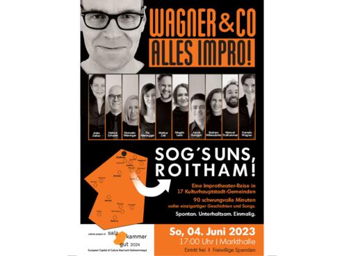 Nach dem Motto „SOG’S UNS, ROITHAM!“ können alle Anwesenden mitentscheiden, worum es auf der Bühne gehen soll. Egal, was Roitham im Frühsommer 2023 gerade bewegt – einfach rausrufen, und schon werden die Themen von WAGNER & CO aufgegriffen und spontan in kurzweilig improvisierte Geschichten und Songs verwandelt. Kein Textbuch, keine Regie - alles wird im Moment auf die Bühne gezaubert.