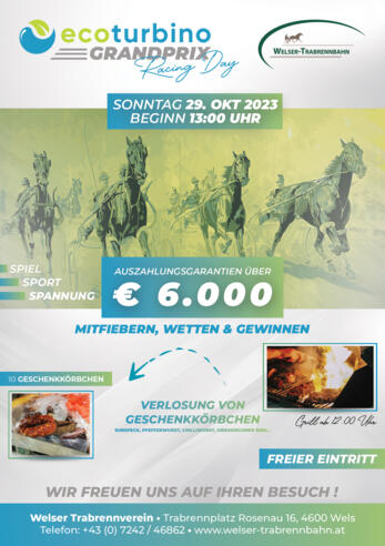Am Freitag, 29. Oktober 2023 um 14:00 Uhr - findet der dritte Renntag auf der Welser Trabrennbahn statt. Erhöhte Gewinnchancen beim Wetten, viele Gewinnspiele sowie ein familienfreundliches Kinderprogramm erwartet die Gäste der Welser Trabrennbahn!