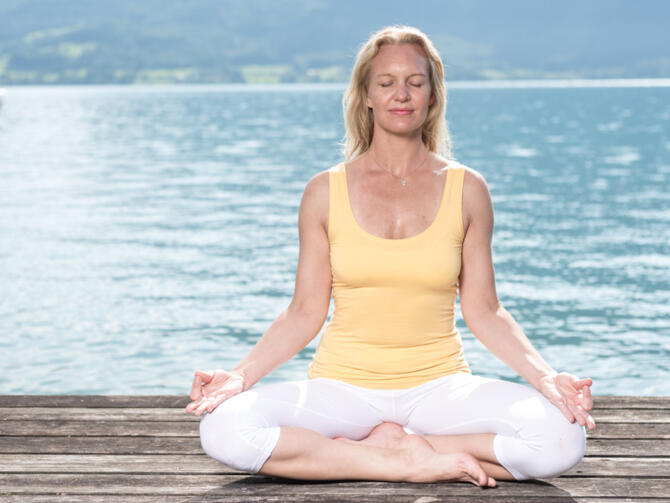 Hier wird am wunderschönen Mondsee direkt am Steg mit Blick auf das Wasser gemeinsam Yoga praktiziert.