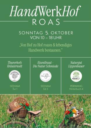 Die 3 Handwerker Höfe laden wieder zur Hand-Werk-Hof Roas recht herzlich ein. Mit ganztägigen Handwerksvorführungen von Drahtkorb flechten, schmieden, drechseln, Flechten von Naturweide, Schuh machen, Verkostungen, Papierkunst, uvm. Das stimmungsvolle Ambiente der 3 Höfe lädt zum Verweilen ein. Thurerhofs Kräuterwelt (Seeham Tur 1), EisenKraut - Die Natur Schmiede (Seeham Ed 3) und Naturgut Lippnbauer (Perwang Hinterbuch 4). Mehr Information und Programm 2024 unter https://thurerhof.at/ueber-uns/hand-werk-hof-roas/
