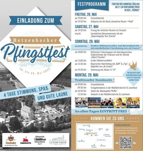 Bierzeltbetrieb (ab 10:00 Uhr): Politischer Frühschoppen mit Albert Füracker13.00 Uhr Oldtimerumfahrt Bayerischer Nachmittag (ab 13:30 Uhr) mit "De Unsern" Abends Stimmung (ab 19:30 Uhr) mit "Route 12 34"