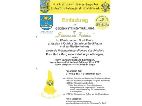 Gedenksteinenthüllung der "Flamme des Friedens" im Pferdezentrum Stadl-Paura und zur Stadterhebung durch die Präsidentin der Flamme des Friedens Frau Herta Margarete Habsburg-Lothringen, sowie Herrn Sandor Habsburg-Lothringen, Herrn Kommerzialrat Herbert Feilmayr, Obst i.TR. Herrn Bürgermeister Christian Popp.
