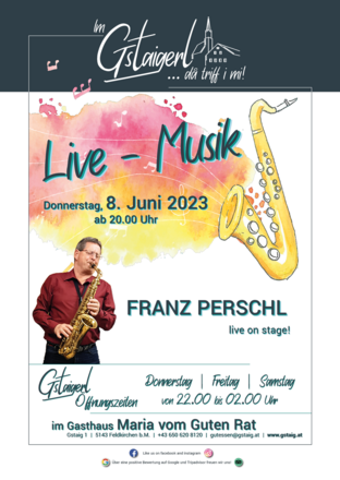Am 8. Juni (Fronleichnam) unterhält der bekannte Musiker Franz Perschl bereits am 20 Uhr die Gäste im Gstaigerl!