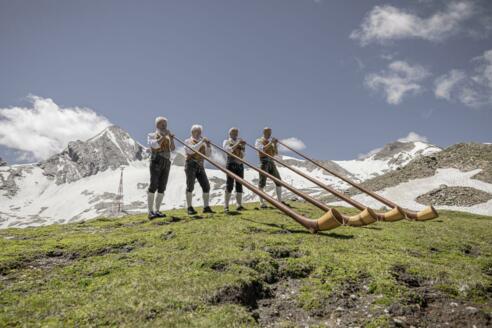 Traditionelle Alphornklänge ertönen an den schönsten Aussichtspunkten während das Restaurant Gletschermühle zum Frühschoppen mit Grill-Special, regionalen Genuss-Ständen, Kinderschminken und Live-Musik von „Pinzga Blech“ lädt.