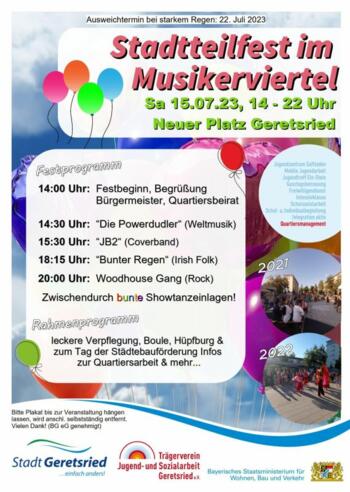 Unser Stadtteilfest am Neuen Platz ist jedes Jahr etwas ganz Besonderes! Wir freuen uns schon auf eine bunte Bühnenschau, gute Musik und leckeres Essen - aber vor allem auf euch Besucher*innen! (Ausweichtermin am 22.07.23)