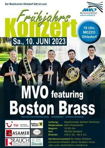 Der Musikverein Ohlsdorf bestreitet gemeinsam mit den Profimusikern des Weltklasseensembles Boston Brass sein Frühjahrskonzert 2023. Im ersten Teil werden einige Stücke gemeinsam vorgetragen, der zweite Teil ausschließlich von Boston Brass. Ein besonderer Hörgenuss den man sich nicht entgehen lassen sollte.