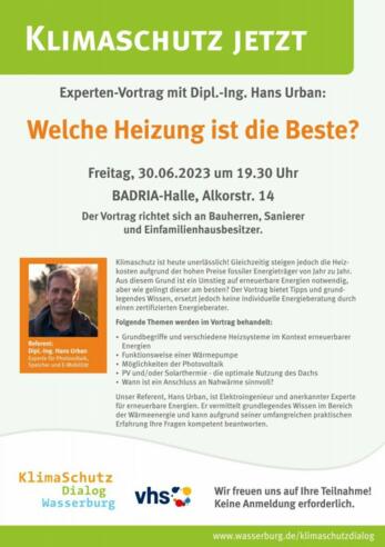 Im Rahmen des KlimaSchutzDialogs und in Zusammenarbeit mit der Stadt Wasserburg und der VHS Wasserburg laden wir Sie herzlich zu unserem Vortrag „Welche Heizung ist die Beste? Weg von Gas und Öl, aber wie?“ ein. Der Vortrag richtet sich an Bauherren, Sanierer und Einfamilienhausbesitzer und findet am Freitag, 30. Juni, um 19.30 Uhr in der Badria-Halle, Alkorstraße 14 statt.Klimaschutz ist heute unerlässlich! Gleichzeitig steigen jedoch die Heizkosten aufgrund der hohen Preise fossiler Energieträger von Jahr zu Jahr. Aus diesem Grund ist ein Umstieg auf erneuerbare Energien notwendig, aber wie gelingt dieser am besten? Der Vortrag bietet Tipps und grundlegendes Wissen, ersetzt jedoch keine individuelle Energieberatung durch einen zertifizierten Energieberater.Folgende Themen werden im Vortrag behandelt: