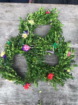 Bei Gesang und den Klängen der "Zugan" werden die Almkranzl gebunden. Dazu werden Zweige, Gräser, Blumen und Kräuter verwendet.