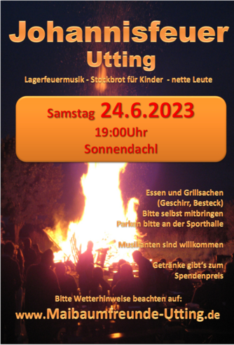 Johannisfeuer Utting auf dem Sonendachl. Kleines Feuer für Stockbrot für Kinder, Grosses Feuer bei Sonnenuntergang. Bitte Essen und Grillsachen selbst mitbringen, Getränke gibt es von den Maibaumfreunden, die auch die Grills zum Selbstgrillen stellen. Musikanten sind willkommen. Parken an der Sporthalle. Bitte Wetterhinweise auf www.maibaumfreunde-utting.de beachten. Veranstaltungstermin Samstag, 24.6.2023 19:00Uhr, Ausweichtermin 1.7.2023.