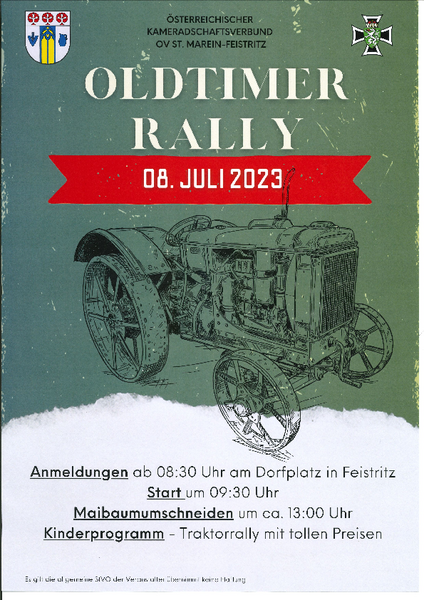Der ÖKB St. Marein-Feistritz lädt zur Oldtimer Rally am 8. Juli 2023 am Dorfplatz Feistritz ein.