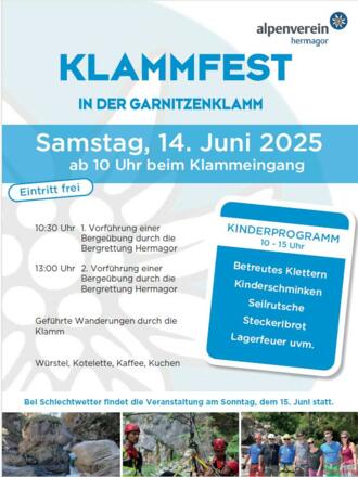 Am Samstag, 14. Juni 2025 findet das Klammfest in der Garnitzenklamm statt. Eintritt frei!