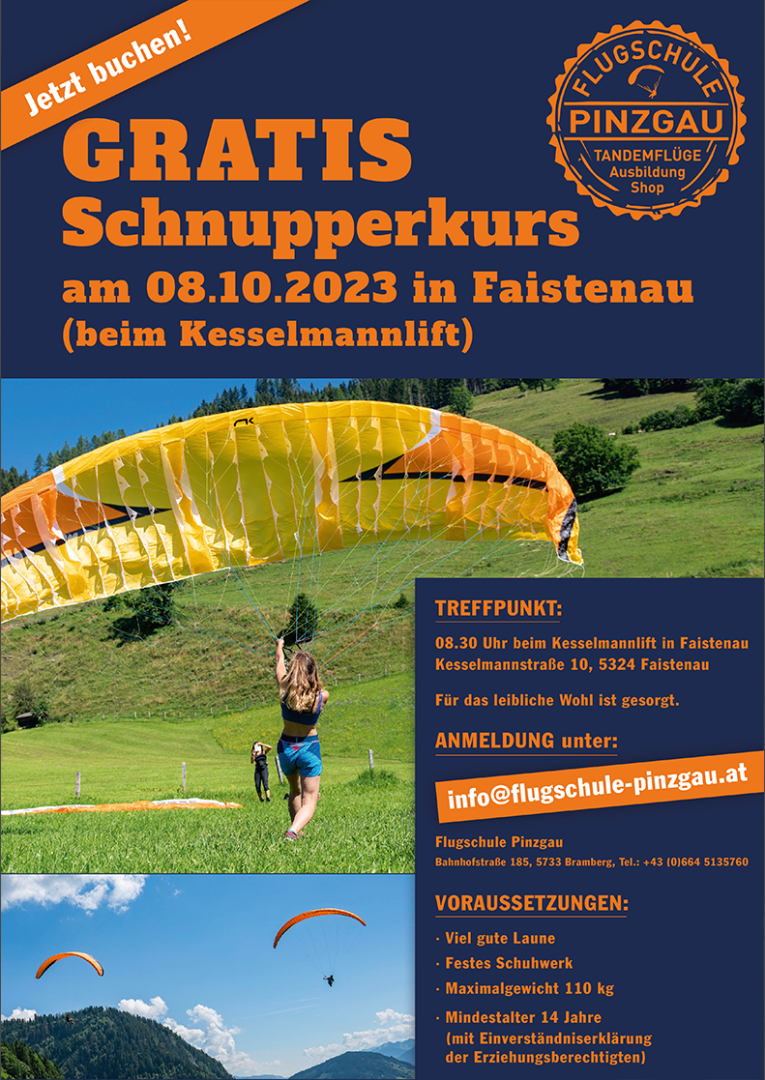 beim Schilift Kesselmann in Faistenau - Christine´s Liftstüberl, ab 8.30 Uhr, Anmeldung & weitere Details bei der Flugschule Pinzgau: info@flugschule-pinzgau.at, +43 6645135760. Voraussetzungen: Viel gute Laune, festes Schuhwerk, Maximalgewicht 110 kg, Mindestalter 14 Jahre.