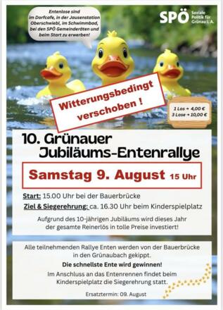 Die SPÖ Grünau veranstaltet die 10. Entenrallye. Gestartet wird um 15 Uhr bei der Bauerbücke, dort werden alle teilnehmenden Enten in den Grünaubach gekippt.