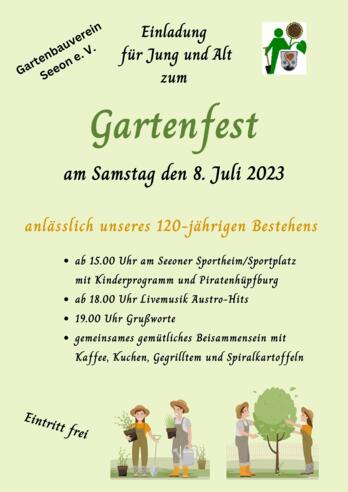 Gartenfest anlässlich des 120-jährigen Bestehens. Für Verpflegung ist gesorgt: Es gibt Grillfleisch, Salate, Spiralkartoffeln und Kaffee und Kuchen. Mit Kinderprogramm und Piratenhüpfburg, ab 18 Uhr Live Musik mit Austro-Hits.