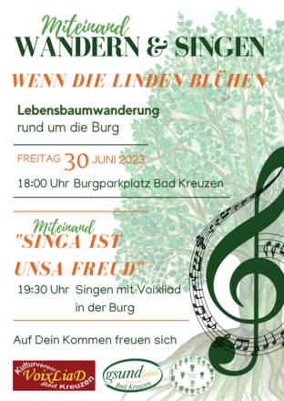 Anschließen um 19.30 ladet die Sing Gruppe des Verein Voixliad zum gemeinsamen Singen ein unter dem Motto: "Singa ist unsa Freud - Wenn die Linden blühen" - ein.