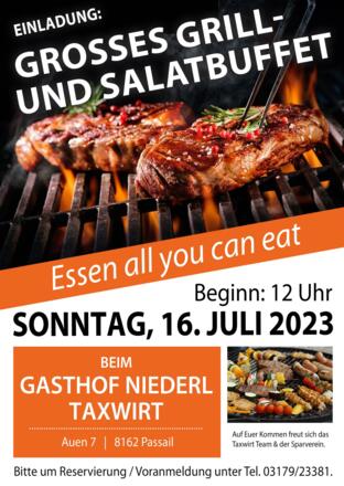 Der Gasthof Niederl Taxwirt lädt Sie am 16. Juli zum großen all you can eat Grill- und Salatbuffet ein.