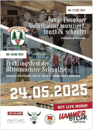 Junge Pongauer Volkskultur musiziert, tanzt & schnalzt. Am 24. Mai 2025 findet in der Altenmarkter Festhalle das Frühlingsfest der Altenmarkter Schnalzergruppe statt. Die Besucher:innen erleben echtes Brauchtum, traditionelle Musik und regionale Köstlichkeiten.