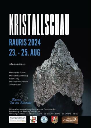 Die Rauriser Stoasuacha präsentieren ihre Funde aus dem Tal der Kristalle. Die Ausstellung lädt nicht nur Insider der Mineralienwelt zu einem faszinierenden Blick ins "Innere" unserer Hausberge und der Hohen Tauern ein. Eröffnung am Freitag: 19 Uhr, Öffnungszeiten: Freitag 18 - 21 Uhr, Samstag 9 - 21 Uhr, Sonntag 9 - 18 Uhr!