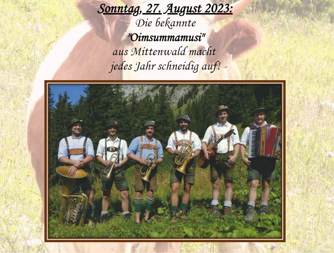 Die bekannte "Oimsummamusi" aus Mittenwald spielt jedes Jahr schneidig auf! / Unsere Almküche bietet hausgemachte, alpenländische Spezialitäten / Wir freuen uns auf Ihren Besuch!