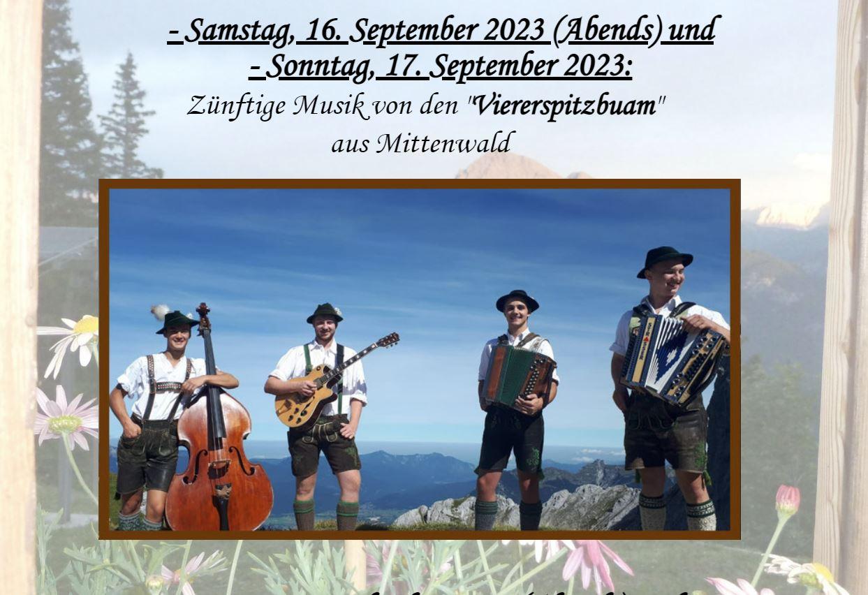 Samstag (Abends) und Sonntag ab 11:00 h gibt's zünftige Musik von den "Viererspitzbuam"aus Mittenwald. Wir freuen uns auf euer Kommen!