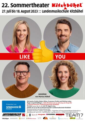 Anlässlich des 22. Sommertheaters Kitzbühel feiert die Komödie „Like you“ Gala-Premiere am 27. Juli 2023 im Konzertsaal der Landesmusikschule Kitzbühel - inklusive Sekt-Empfang und Flying Buffet.
