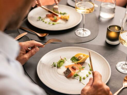 Im exklusiven Restaurantbereich FinESSEN ladet dich Executive Chef Christof Schernthaner & sein Team auf eine kulinarische Reise rund ums Motto ‚Wald & Fluss‘ ein. Freue dich auf regionale Spezialitäten, feine Aromen, raffinierte Gewürze und überraschende Geschmackserlebnisse - saisonal abgestimmt, die höchsten Genuss versprechen.