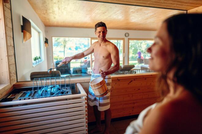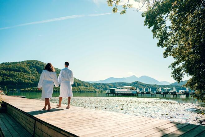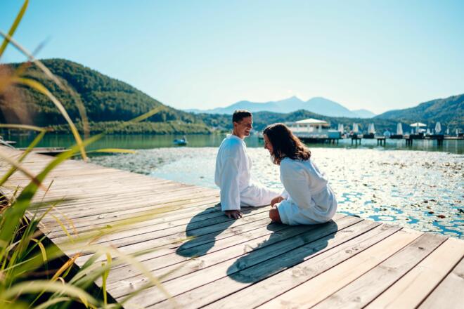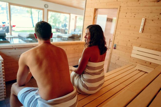 Relaxe in der modernen Panorama-Sauna mit Ausblick auf den Klopeiner See. Highlight ist die Seesauna mit Ruheraum im neuen Seehaus mit Privatstrand.