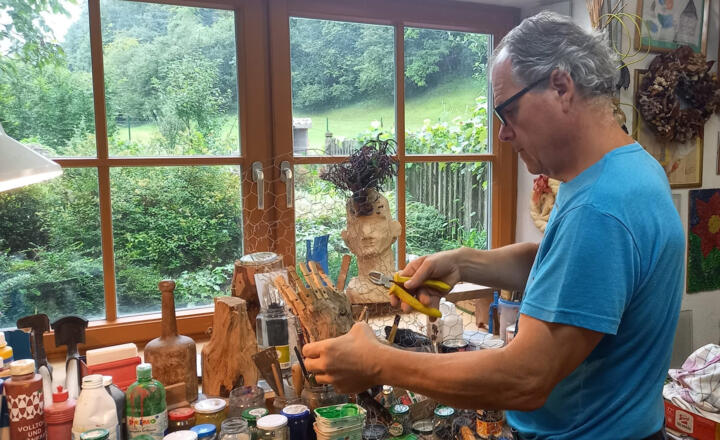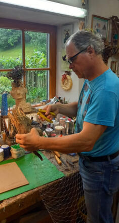 " Holz gehört zu meinem Leben. Als Kind habe ich schon in den Bächen nach fantasievollen Wurzelgebilden gesucht und sie wie einen Schatz aufbewahrt, habe mit Holz gezimmert und zu tischlern versucht, im Wald mit meinem Vater Holz geschlägert , Baumhütterl gebaut - zum Leidwesen meines Vaters, weil ich sein Werkzeug und seine Nägel heimlich verbraucht habe - mit dem „Taschenfeitl" vom Kirtag Zierstäbe aus Haselnussstecken geschnitzt. Holz wurde mir vertraut. Meine Arbeiten sind oft spontane Grundideen und entwickeln sich im Arbeitsprozess weiter und münden in immer verspielteren Ausformungen und Detailfindungen bis ich mich selbst stoppen muss. Ich freue mich sehr, wieder in der Galerie AM FLUSS meine neuen Arbeiten zu präsentieren.