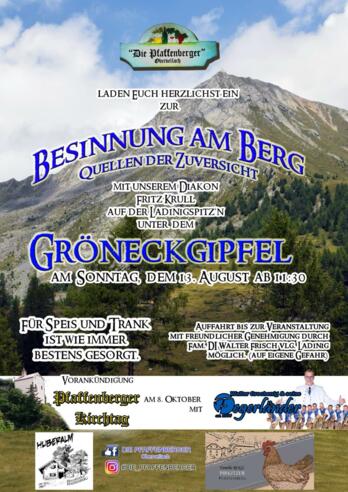 Zur „Besinnung am Berg - Quellen der Zuversicht“ mit Diakon Fritz Krull wird auf der Ladinigspitze, unter dem Gröneckgipfel herzlich eingeladen.