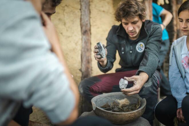 Präsentationen steinzeitlicher Handwerkstechniken (Steine-Bearbeitung, Feuerentfachen und Wassersieden mit Steinen)