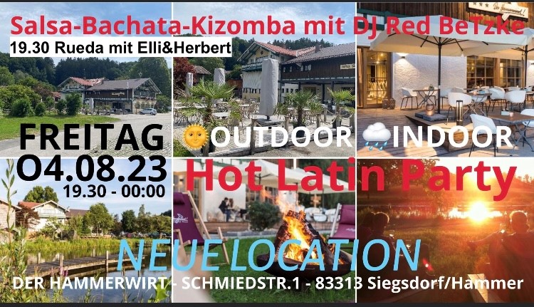 Salsa - Bachata - Kizomba mit DJ Red BeTzke beim Hammerwirt. Bei gutem Wetter tanzen wir auf einer schönen Holzterrasse, genießen den traumhaft schönen Garten mit Blick auf den hauseigenen Naturbadesee, chillen im Liegestuhl oder sitzen gemütlich am Lagerfeuer. Bei schlechtem Wetter indoor in Zitas Lounge & Bar mit großer Tanzfläche und stylischem Ambiente. Für beste Musik sorgt DJ Red BeTzka.